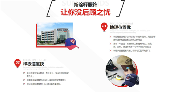 东莞市新解释衣饰无限公司多年帽子定制(zhì)供给经历,6000平自有厂(chǎng)房,大型配套的版(bǎn)房、绣花车间(jiān)、出产车间(jiān),推销、出产、绣花、印花、品管等(děng)多个完美的配套部分,经历丰硕,规范化(huà)流(liú)水线出产,保质保量。